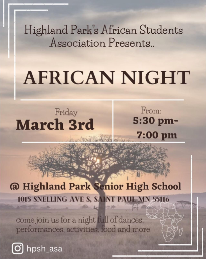 On March 3rd, Highland Park Senior High hosted the second annual African Night! African Night showcased a variety of different cultures, dances, poems, clothing, and food. Students who are a part of Highland’s African Student Association (ASA) put in a lot of time and effort to make it an enjoyable and fun filled night. The turnout was huge with lots of people coming from all over St. Paul!