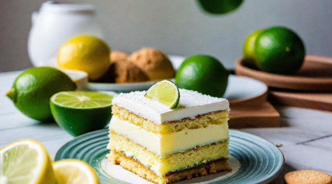 You end up with the lime mixture on the top and if you like, you could leave it as it is or what ‘s more preferred is to add Maria cookies on top to cover every part of the cake and add some lemon zest on top!