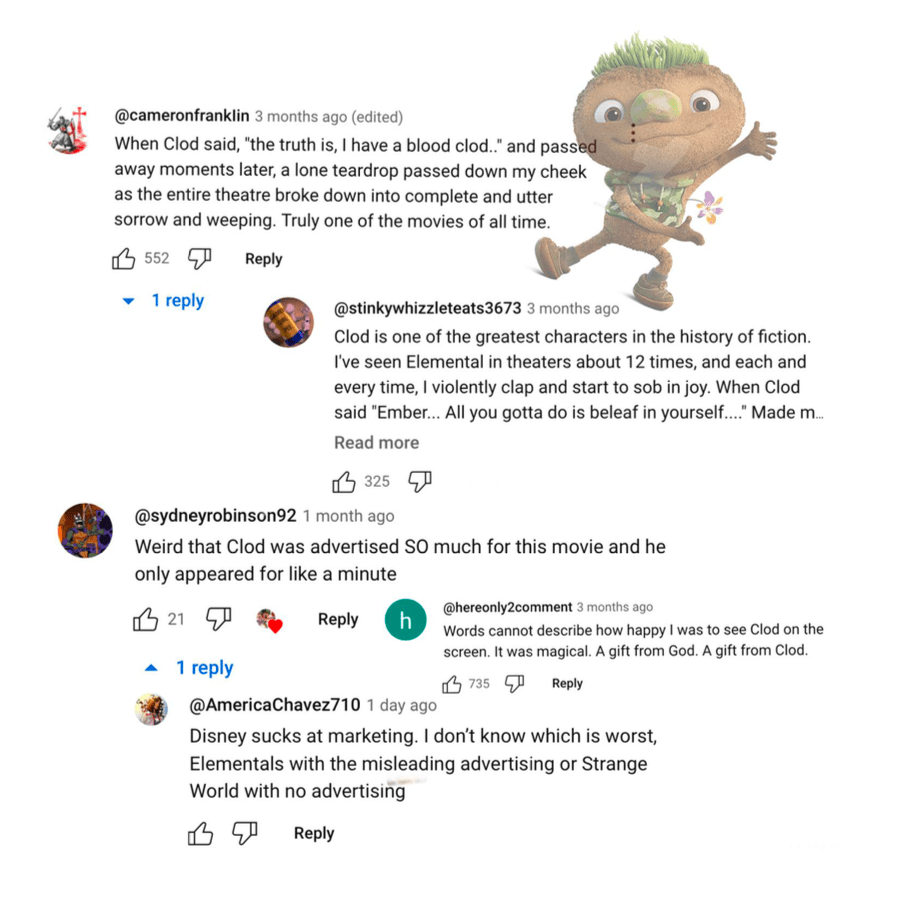 However, Clod has less than 3 minutes of screen time in the actual movie, so the amount of time they spent promoting this character lead to people finding it misleading. There was even a short-lived meme where people made sarcastic comments behaving like they cared about Clod, saying that they screamed when he came on screen and cried.