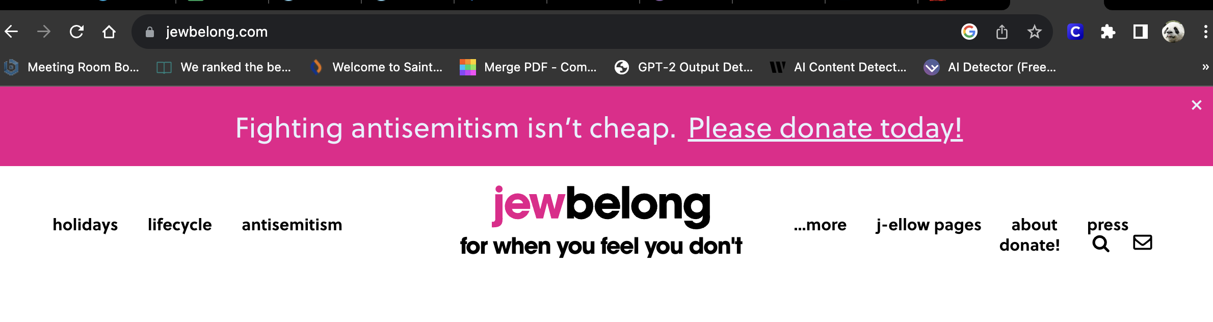 JewBelong’s website: https://www.jewbelong.com/ has the same intentions. It’s pink, vibrant, and uses words going straight to the point. Their website offers guidance on how to celebrate Jewish holidays, weddings, Bris’s, and B’nai Mitzvah. They have links to news articles on their billboards, an educational page, a team page, and so much more. On their team page, they use pictures of themselves, but as children, again with the purpose of making the viewer feel.