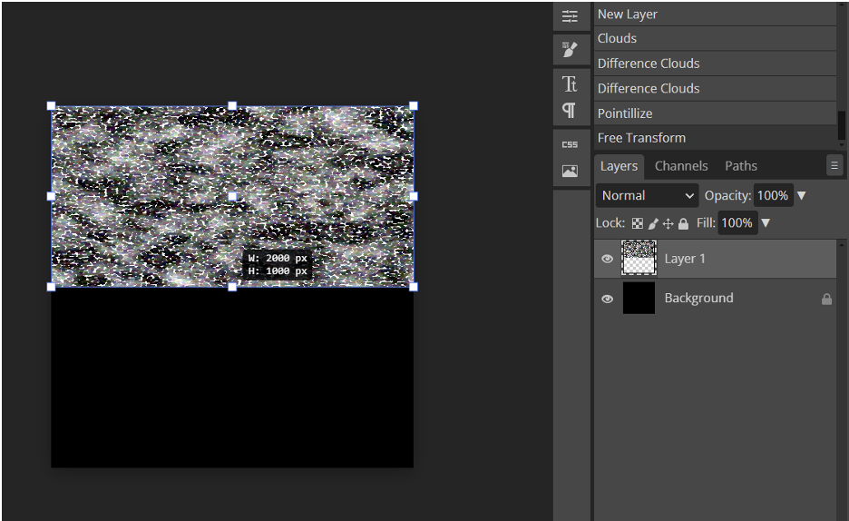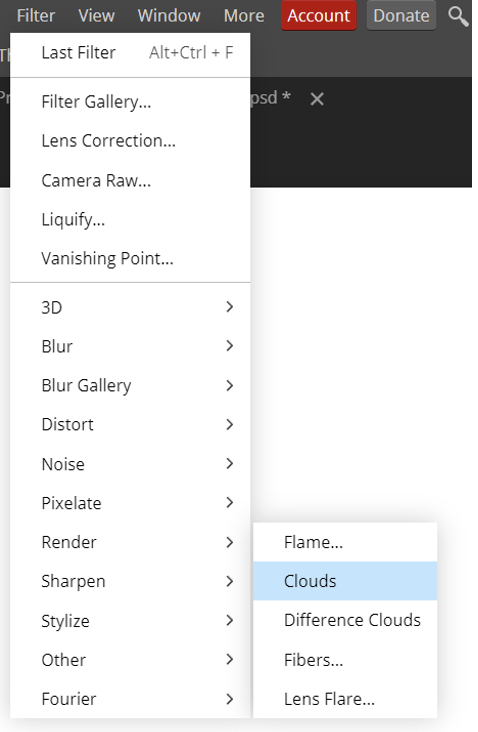 Select your new layer and go to the “Filters” tab at the top. There go to the “Render” tab and click the “Clouds”. Repeat this process again but instead of clicking “Clouds” you click on “Difference Clouds” twice.