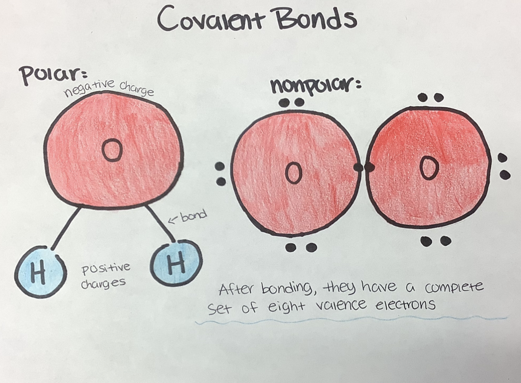 The aspect of covalent bonding is the formation of a complete set of valence electrons after two elements share the adequate amount of electrons with one another. And with this type of bonding there are subcategories of polar and nonpolar covalent bonding.