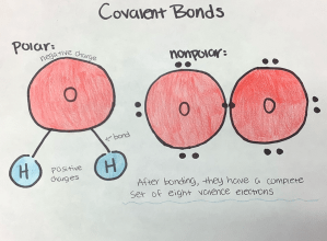 Now for the big question. How can we find Covalent Bonding in our everyday lives? Well, that is simple to answer. If we truly analyze it, we can tell that covalent bonds are in more than we may have initially thought. For example, one of the most popular examples is the properties H2O. According to the distinguished researchers at the University of Hawai’i at Mānoa, “The unequal sharing of electrons between the atoms and the unsymmetrical shape of the molecule means that a water molecule has two poles-a positive charge on the hydrogen pole (side) and a negative charge on the oxygen pole (side). We say that the water molecule is electrically polar.” This demonstrates that a polar covalent bond is how H20 comes about. And we use water in our everyday lives. It is the basis of everything, and something we rely on so heavily. Besides water, covalent bonds also may be found in our air and more, as mentioned in the first paragraph.