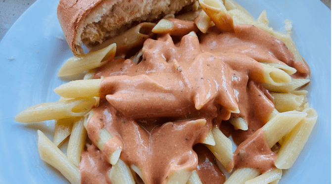 The sauce is altogether so creamy and enjoyable to eat. The sauce also has a lot of flavor to it from the warm tomato flavor to the savory onion and sweet cream. I like how you can also make this recipe your own by using whatever base sauce you want and adding things to your specific taste.