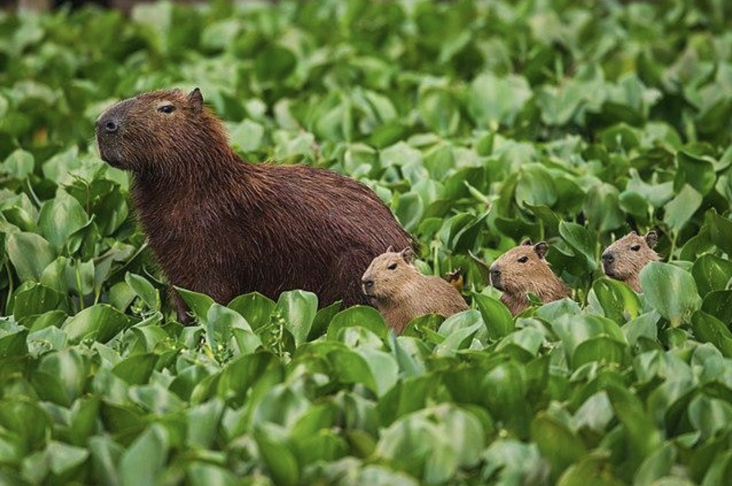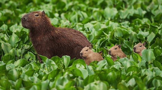 The capybara is native to South America; their habitat is in areas with dense vegetation and plenty of water bodies. They also are semi-aquatic and enjoy spending their time in water.