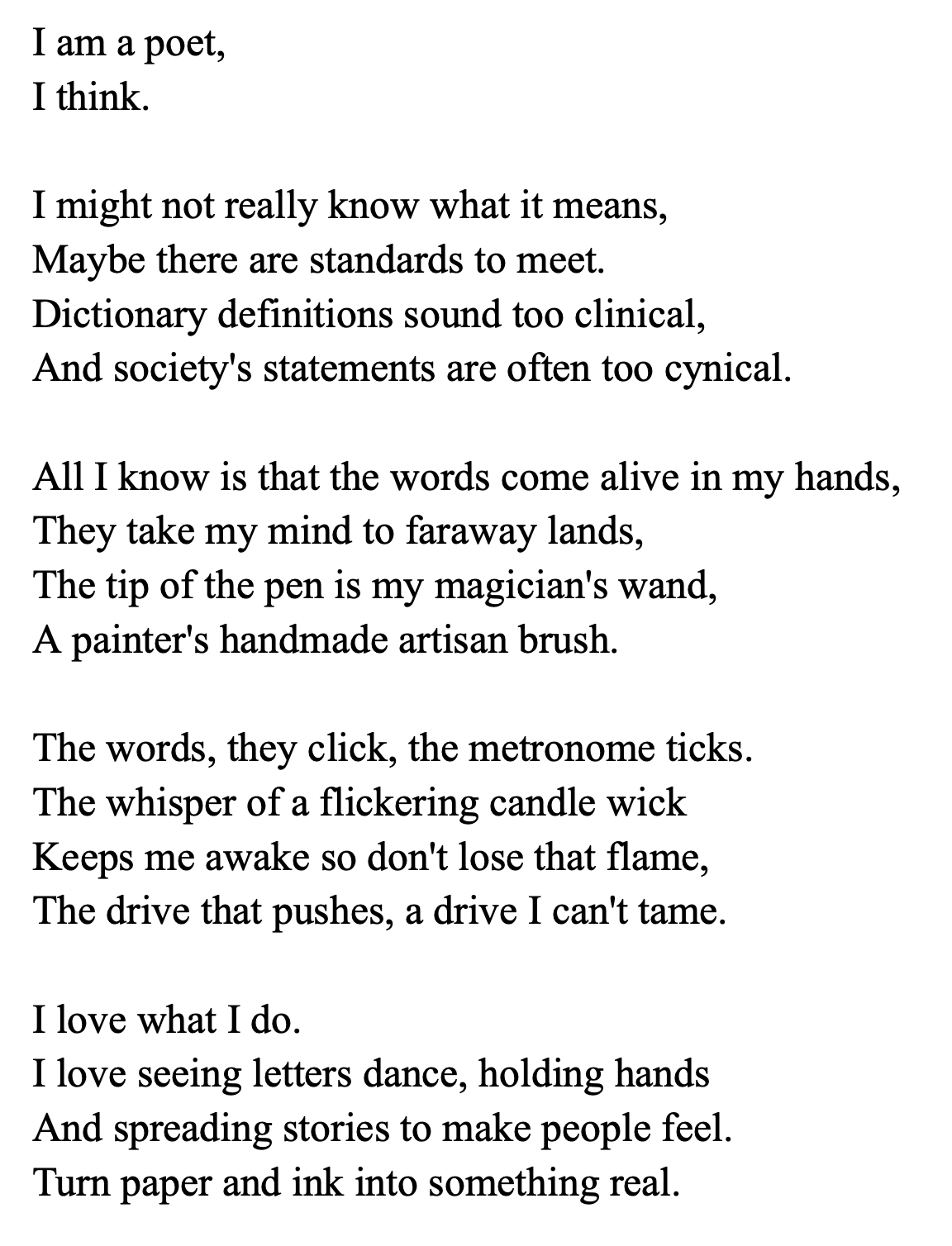 Student Creative Writing Simply a Poet May 26, 2025 HPSH Plaid Line Leave a comment By: Violet Hirman Share this: Click to share on X (Opens in new window) X Click to share on Facebook (Opens in new window) Facebook Like Loading... Related