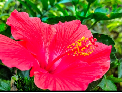 This photo is of a red tropical hibiscus flower and was taken in Miami, Florida.