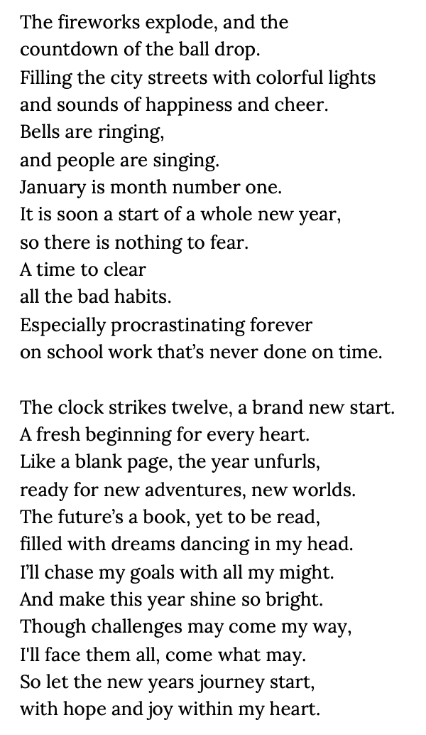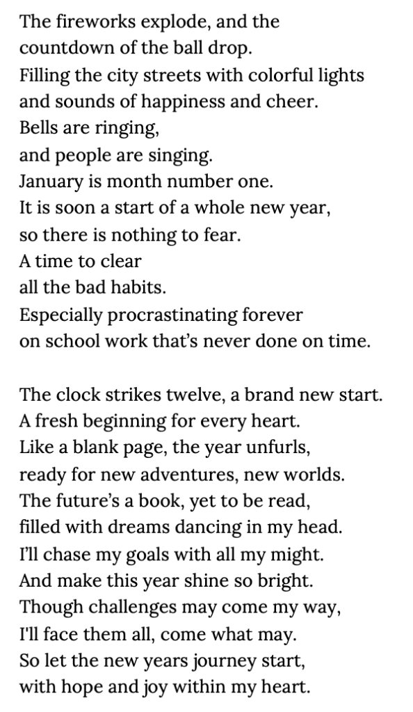 PRIZM, Student Creative Writing New Years January 13, 2026 HPSH Plaid Line Leave a comment By: Seng Nhkum Share this: Click to share on X (Opens in new window) X Click to share on Facebook (Opens in new window) Facebook Like Loading... Related