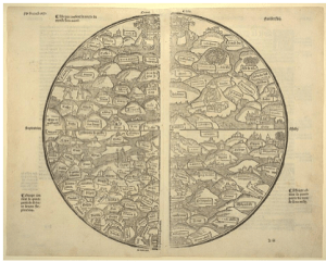 Around 600 BCE, more world maps were created in Ancient Greece with major scientific advances, but with no measure of scale. One such example is the map that the Greek philosopher Anaximander created around 600 BCE, which represented the world as a circular disk surrounded by oceans. In 200 BCE, Claudius Ptolemy, a Greek-Egyptian scholar, created his work Geographia, outlining latitude and longitude for accurate navigation as well as mapping thousands of areas with coordinates. He was also the first to display the world on a two-dimensional surface, and thus he’s commonly credited as the creator of cartography, or the study of mapmaking.