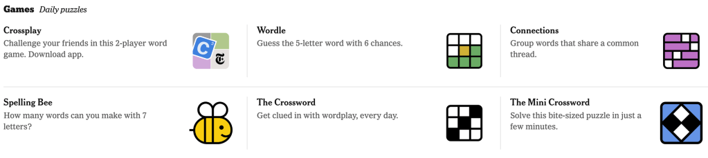 Connections is probably my favorite New York Times game. It was developed for about a year before being released to the public in June of 2023, as time went on it rapidly gained popularity, and in 2025 it had 3 million daily players. It is where you have 16 words and 4 groups of 4 that you have to find. It varies in difficulty level but typically is not too hard if you think through it thoroughly. I would rate this game 10/10.
