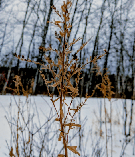 This photo was taken on Thatcher Lake in Wisconsin and is of a frozen stalk of grain.
