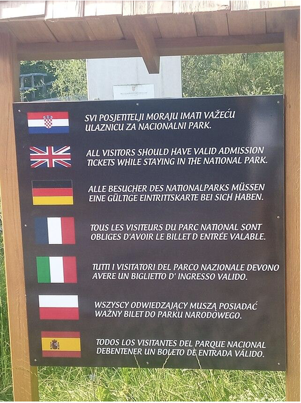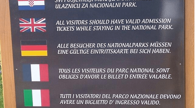 Multilingual information board in Plitvice Lakes National Park in Croatia. July 2023 by: Mudroslov via Wikimedia Commons