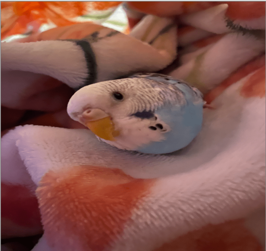 My bird’s name is Sky and she’s getting really comfy with the soft blanket.