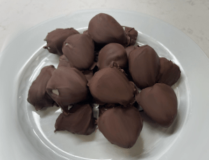 Once they all were coated in white chocolate, we moved onto the dark chocolate. We used the same process of melting, and because the strawberries were frozen to start, the chocolate hardened onto the strawberries so we did not have to put them back into the freezer. After they were all dipped, they were ready to eat!