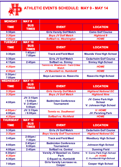 Badminton, Baseball, Golf, Lacrosse, Scoreboard/Schedule, Softball, Track & Field Sports schedule for: May 16-21 Image May 18, 2022 HPSH Plaid Line Leave a comment